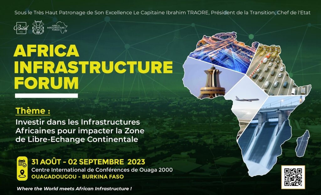 Le Gouvernement du Burkina Faso en partenariat avec BITEL GROUP organise le AFRICA INFRASTRUCTURE FORUM du 31 Août au 02 Septembre 2023 au Centre International de Conférences de Ouaga 2000 sous le thème « Investir dans les Infrastructures Africaines pour mieux impacter la Zone de Libre Échange Continentale ».